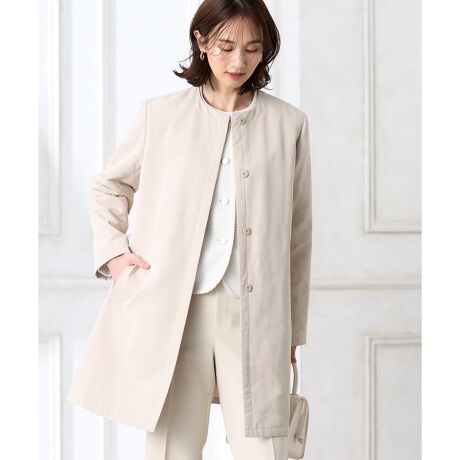 [型番:355615]すっきりとした首元が上品な印象をつくるノーカラーコート。シンプルながらも美しいシルエットで、デイリーから通勤スタイルまで幅広く活躍。軽やかな着心地ながら、きちんと見えするデザインが魅力です。パンツでシャープに、スカートやワンピースと合わせて女性らしくも楽しめる万能アイテム。長い季節に寄り添う一着です。