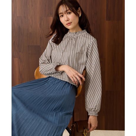 [型番:521144]1枚で華やぐ上品シャーリングデザインプルオーバー首元に施したシャーリングがさりげなく華やかさを添えるプリントプルオーバー。落ち着いたトーンの総柄で、大人っぽく着こなせるアイテムです。袖口にもゴムを入れ、ふんわりとしたシルエットが女性らしさを演出。デニム合わせでカジュアルに、きれいめボトムと合わせて上品にも使える万能トップスです。