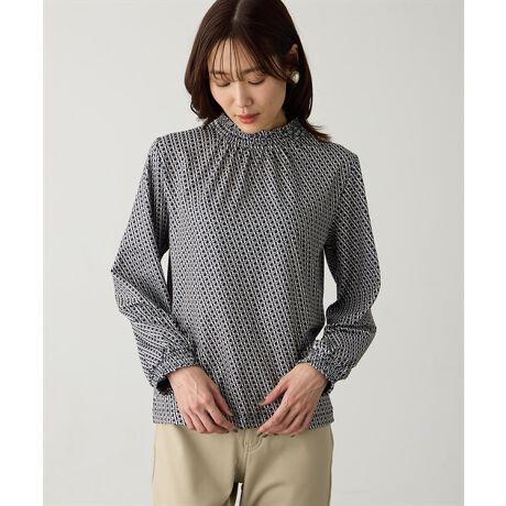 [型番:521144]1枚で華やぐ上品シャーリングデザインプルオーバー首元に施したシャーリングがさりげなく華やかさを添えるプリントプルオーバー。落ち着いたトーンの総柄で、大人っぽく着こなせるアイテムです。袖口にもゴムを入れ、ふんわりとしたシルエットが女性らしさを演出。デニム合わせでカジュアルに、きれいめボトムと合わせて上品にも使える万能トップスです。