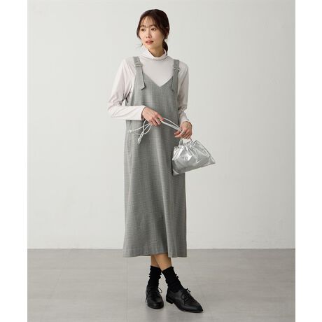 [型番:525236]上品シルエットで大人見えが叶うバックル付きジャンスカショルダーのバックルデザインがポイントのジャンパースカート。すっきりとしたストレートシルエットで、体のラインを拾いにくく上品な印象に仕上げました。インナーを変えるだけでカジュアルにもきれいめにも着回せ、季節を問わず長く使える万能アイテムです。※グレー=チェック柄※ブラック=無地