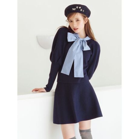 ボリュームを持たせた袖は、今年らしいモード感をプラスしながらも女性らしいラインをキープ。スカートはフィット&フレアにこだわることで、自然とスタイルアップへ導いてくれるシルエットに。