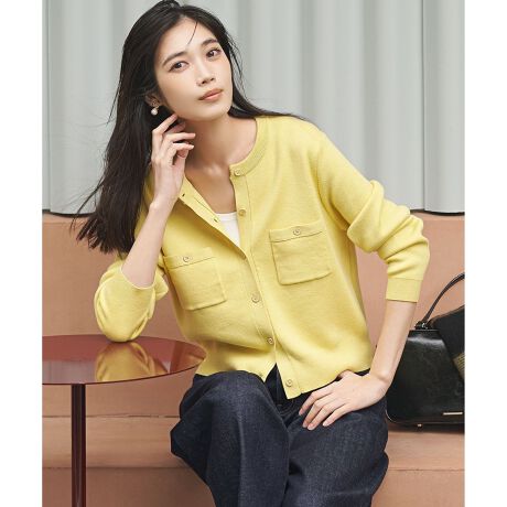 二重に編み立てることで、程よくしっかりとした厚みと美しいシルエットを保つニットカーディガンです。なめらかな肌触りの上質素材は、オンオフ問わず幅広いシーンで活躍する汎用性の高さが魅力。胸元のポケットがさりげないアクセントとなり、それぞれのカラーに合わせて染め上げたボタンが、全体をシックにまとめ、上品な印象を与えます。 一枚でプルオーバーのように着こなしたり、ワンピースやブラウスの上に軽く羽織ったりと、様々なスタイリングをお楽しみいただけます。きれいめパンツと合わせてオフィススタイルに、デニムやワイドパンツと合わせて大人のカジュアルスタイルにと、着回し力も抜群です。 カラーは、顔周りを明るく見せる優しい印象のライトイエロー(#042)、どんな色とも合わせやすい上品で柔らかなアイボリー(#002)、コーディネートの主役になる鮮やかで華やかなレッド(#010)、爽やかで清潔感のある澄んだ空のようなスカイブルー(#072)、知的で落ち着いた印象を与える深みのあるネイビー(#075)、気分をリフレッシュさせる軽やかで優しいライトグリーン(#062)の6色展開です。