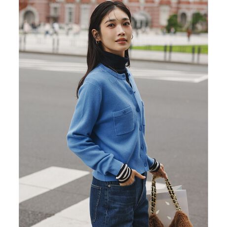 二重に編み立てることで、程よくしっかりとした厚みと美しいシルエットを保つニットカーディガンです。なめらかな肌触りの上質素材は、オンオフ問わず幅広いシーンで活躍する汎用性の高さが魅力。胸元のポケットがさりげないアクセントとなり、それぞれのカラーに合わせて染め上げたボタンが、全体をシックにまとめ、上品な印象を与えます。 一枚でプルオーバーのように着こなしたり、ワンピースやブラウスの上に軽く羽織ったりと、様々なスタイリングをお楽しみいただけます。きれいめパンツと合わせてオフィススタイルに、デニムやワイドパンツと合わせて大人のカジュアルスタイルにと、着回し力も抜群です。 カラーは、顔周りを明るく見せる優しい印象のライトイエロー(#042)、どんな色とも合わせやすい上品で柔らかなアイボリー(#002)、コーディネートの主役になる鮮やかで華やかなレッド(#010)、爽やかで清潔感のある澄んだ空のようなスカイブルー(#072)、知的で落ち着いた印象を与える深みのあるネイビー(#075)、気分をリフレッシュさせる軽やかで優しいライトグリーン(#062)の6色展開です。