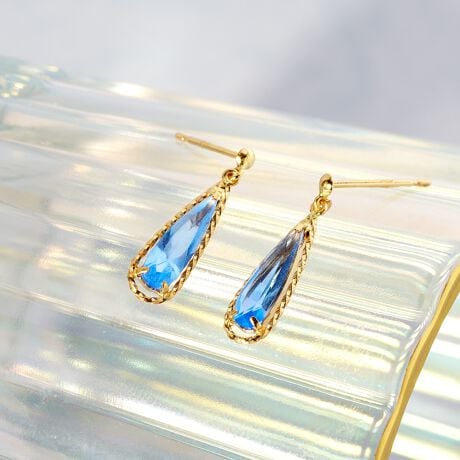 [型番:43-8696]雫のフォルムが美しいブルークォーツをあしらったピアス。透明感のあるブルーが光を受けて柔らかく揺れ、清楚で洗練された印象をもたらします。シンプルながらも存在感があり、顔まわりを明るく見せてくれるデザイン。季節を問わず使える、爽やかさとエレガンスを兼ね備えた一品です。