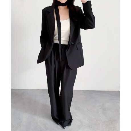 モードなムードを纏うテーラードジャケットとワイドパンツのセットアップ。