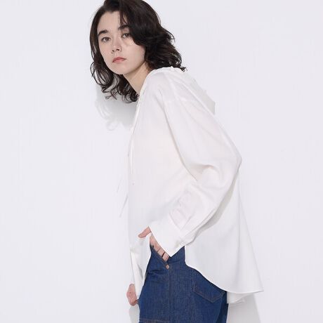滑らかな肌触りのフード付きブラウスです。
