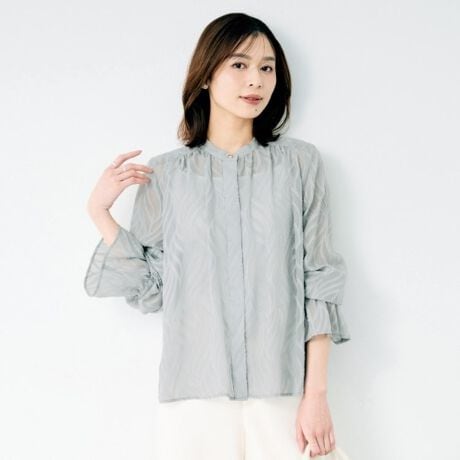 シアー感のあるジャカード素材が特徴のブラウス。