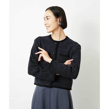 モール糸にラメと細かなスパンコールを散りばめた、華やぎのあるニットジャケット。コンパクトなサイズ感で軽やかに羽織れ、スタイリングにほどよい存在感を添えてくれます。 40サイズは限定店舗展開です。