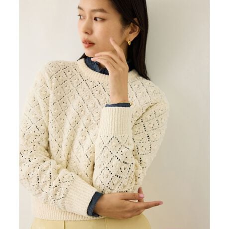 ダイヤ柄の透かし編みが、女性らしさを引き立てるプルオーバー。