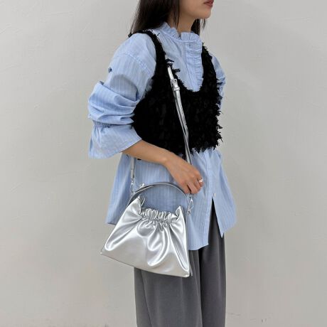 ・ギャザーを寄せた三角フォルムが持つだけでこなれ感を演出するワンハンドルバッグ