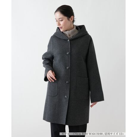 ゆったりとしたAラインのシルエットが、体を優しく包み込み、軽やかな着心地を叶えます。暖かみのある厚手の生地で仕立てられたフードは、首元を優しく彩り、ちらりと覗く裏地の柄がさりげないアクセントを添えます。フロントに配された丸みのある大きなボタンや、実用的なパッチポケットが、全体のデザインに柔らかな印象をプラスします。膝にかかる上品な丈感とドロップショルダーの組み合わせが、こなれた雰囲気を演出し、様々なスタイルに調和します。