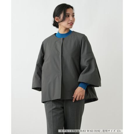 軽やかな着心地と暖かさを両立した、中わた入りのノーカラーコートです。充填物にはしなやかな繊維を使用しており、着膨れしにくく、すっきりとしたシルエットを保ちます。上品なノーカラーの丸首デザインと、手元に抜け感を演出する七分袖が、女性らしい印象を与えます。季節の変わり目にはアウターとして、冬本番にはインナーコートとしても活躍する、着回し力の高いアイテムです。シンプルなデザインなので、マフラーやアクセサリーなどの小物使いも楽しめます。