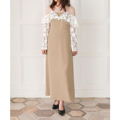 バストからスリーブへと流れるレースのラッフルが印象的な一着。