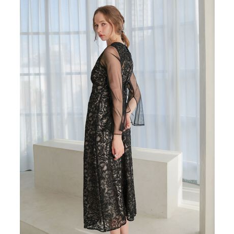 動くたびさりげなく輝くスパンコール刺繍とレイヤード風のバックスタイルが目を引く 抜け感のある華やかな刺繍ドレス。
