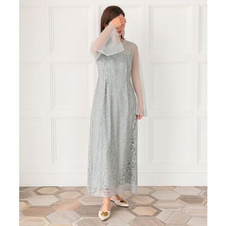 動くたびさりげなく輝くスパンコール刺繍とレイヤード風のバックスタイルが目を引く 抜け感のある華やかな刺繍ドレス。
