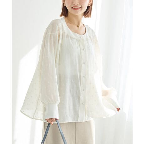 シアー感とフロッキードットが女性らしさを引き立ててくれるブラウス。