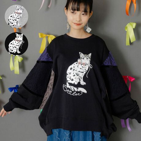 フロントには箔プリントをミックスしたネコモチーフをあしらい、