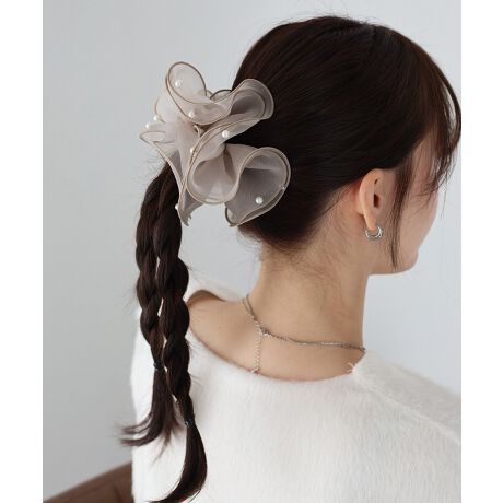 ボリューム感のあるオーガンジー生地に上品な光沢のパールが華やかさを添えるシュシュ。