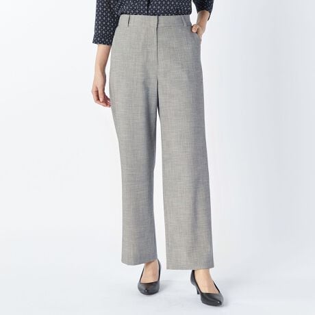 遠目には単色にも見える、緻密なハウンドトゥース柄を用いたパンツ。腰まわりがすっきりと見えるノータックデザインで、ワイドながらもエレガントな印象です。背面をゴム仕立てにしており、窮屈感なく楽しめるのが特徴。トップスの裾をインさせる着こなしもバランスよくまとまります。ジャケットを合わせるとよりかっちりとした装いが完成します。