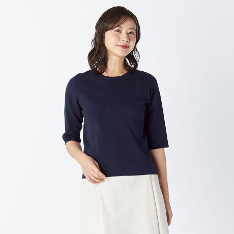 シンプルで上品なクルーネック仕様の5分袖ニットプルオーバー。平らな編み目とさらっとした肌触りが魅力のミラノリブニット生地を使用しています。フィットし過ぎないシルエットや長過ぎない着丈もこだわりのポイント。合わせるボトムやアウターを選ばず、同生地のジャケットとアンサンブルでも着用可能です。