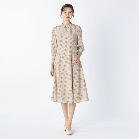 クラシカルなジオメトリックパターンを散りばめた素材のワンピース。襟のあるデザインで、かしこまった印象の着こなしを楽しめます。落ち感のある素材と、ウエストを絞ったシルエットで、立ち姿をエレガントに映し出すデザイン。華やかな柄使いはオケージョンシーンにも最適です。透け感が気にならない裏地付き。
