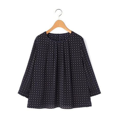 軽やかなポリエステル生地で仕立てたジオメトリック柄の7分袖ブラウス。さらっと着こなせるプルオーバータイプで、ほどよい開きのラウンドネックや柔らかなタックデザインが女性らしい印象です。合わせるボトム次第でカジュアルにもきれいめにも着用でき、同生地のスカートとセットアップでも楽しめます。