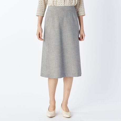 遠目に見ると単色のような、細かなハウンドトゥース柄を用いたスカート。広がりを控えめにした台形のシルエットが、大人らしい気品を引き立てる1点です。膝が隠れる着丈も落ち着きがあり、好印象。ノーカラージャケットやツイードジャケットなどを合わせると、よりきちんとした印象の着こなしを楽しめます。