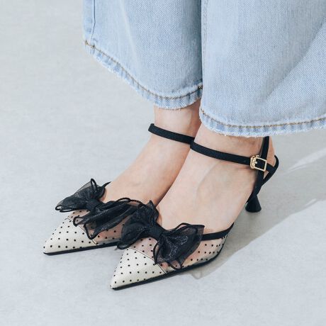 ふわっとした立体感のあるリボンがレディなムードたっぷりなパンプス!透けすぎない絶妙なシアー感のチュール素材は、足に優しい柔らかさで履き心地◎ストラップデザインで歩行時でもホールド感があり、5段階サイズ調節が可能なのも嬉しいポイントです。約5.5cmのキュッとくびれたフレアヒールは、安定感があり歩きやすいだけでなく、履くだけで美脚効果も叶えてくれます。スカートやワンピースにもピッタリですが、デニムに合わせてカジュアルダウンして履くのもおすすめです!