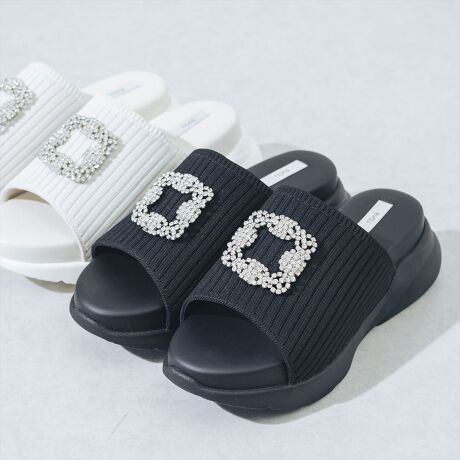 キラキラと上品に輝くバックルが夏のコーディネートを格上げしてくれるビジュースポサン!甲深のニットアッパーには裏地付きで、程よいハリ感がありミュールタイプでもホールド感抜群の履き心地です。スッと履けるデザインで楽に着脱出来るのもミュールならではの嬉しいポイント◎超軽量な厚底ソールと、ふかふかもちもちした新感覚の中敷きは、1度履いたら病みつきになること間違いなし!カジュアルから綺麗めまで、幅広いコーディネートに合わせやすい優秀アイテムです。
