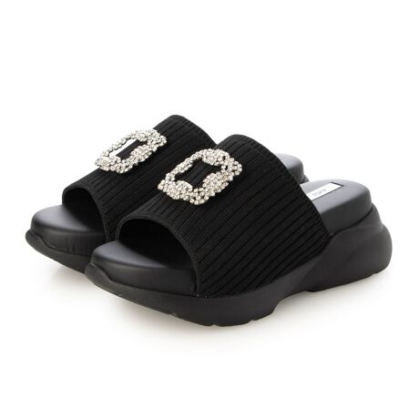 キラキラと上品に輝くバックルが夏のコーディネートを格上げしてくれるビジュースポサン!甲深のニットアッパーには裏地付きで、程よいハリ感がありミュールタイプでもホールド感抜群の履き心地です。スッと履けるデザインで楽に着脱出来るのもミュールならではの嬉しいポイント◎超軽量な厚底ソールと、ふかふかもちもちした新感覚の中敷きは、1度履いたら病みつきになること間違いなし!カジュアルから綺麗めまで、幅広いコーディネートに合わせやすい優秀アイテムです。
