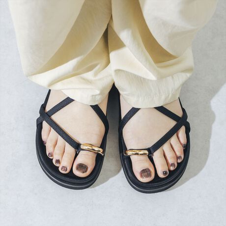 さりげなく輝くゴールドパーツが夏の足元にリュクスなアクセントをプラスしてくれる厚底サンダル!華奢なクロスストラップが足元を美しく魅せながら、程よい厚底ソールでスタイルアップも叶えてくれます。フック式のストラップは着脱が簡単で、5段階サイズ調節可能なのも嬉しいポイント!驚くほど軽量なので、普段使いはもちろん、旅行やリゾートにもぴったりです◎幅広いコーディネートに合わせやすく、この夏持っておきたいマストアイテム!