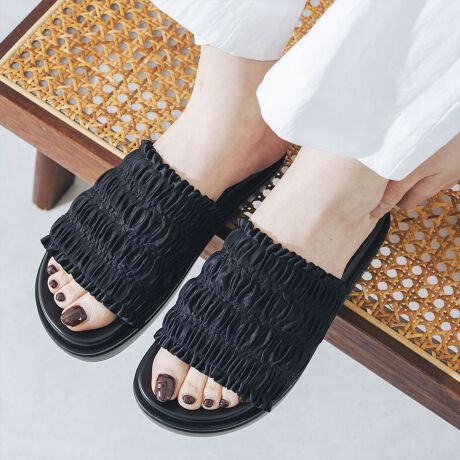 甘すぎず大人っぽい絶妙なギャザーフリルが魅力的なミュールサンダル!甲深のアッパーが足にしっかりフィットして、ミュールデザインでも脱げる心配なく安心して着用いただけます。驚くほど軽量でふかふかな履き心地の厚底ソールは、屈曲性があるので足運びしやすくたくさん歩く日でも疲れにくさ◎シーズンムードを盛り上げてくれるフリルアイテムは、旅行やリゾートでの着用にもおすすめです!