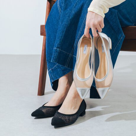 カジュアルからオケージョンまで幅広いシーンで活躍するフラットパンプス!ポインテッドトゥと合わせることで、フラットデザインでもすっきり綺麗に見せてくれます!柔らかいチュール素材は足馴染み良く、程よい透け感が大人っぽく上品な印象に。ぷっくりとした肉厚な中敷きが足裏への負担を軽減してくれて、約2cmのローヒールで安定感抜群の履き心地◎シアー感たっぷりのアイテムは、この春夏おさえておきたいトレンドアイテムです!