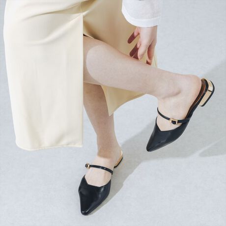 高級感のあるメタルヒールとぷっくりとした立体的なバックルが春夏のコーディネートにぴったりハマるミュールが登場!柔らかい素材を使用しているので、シャープな見た目ですが足馴染み良い履き心地です。華奢なベルトはサイズ調節可能で、お好みのフィット感で履けるのも嬉しいポイント◎甲の深い部分に設定されているので、しっかり足をホールドして歩行時の踵のパカパカ感を軽減してくれます!ふかふかの中敷き入りで足裏に優しく、たくさん歩く日にもぴったりです。素足で抜け感を出したり、ソックス合わせでこなれた雰囲気で履くのもおすすめ!