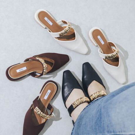 大注目のニュアンスメタルを取り入れたミュールが登場!クールさがありつつ上品さも兼ね備えどんなコーディネートにもぴったりハマる究極の逸品。程よいハリ感がありながらも柔らかい素材を使用し、シャープな見た目ですが足馴染み良く着用いただけます。メタルパーツのベルト根本部分はゴム仕様で、歩行時でも程よく伸縮してくれてフィット感◎ふかふかの中敷きは足裏に優しく、普段使いはもちろん、長時間のお出かけや旅行にもおすすめです。ミュールデザインは手を使わずスッと脱ぎ履き出来るのも嬉しいポイント!