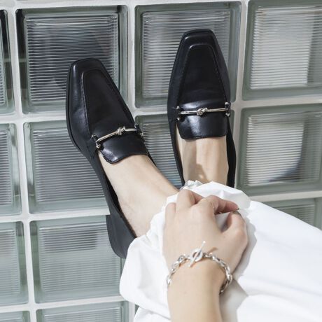 高級感漂うノットデザインのモチーフが目を惹くローファー!程よいハリ感がありながらも柔らかい素材でソフトな足当たりです。内側にはふわふわ柔らかい素材を使用し、足に優しい履き心地に仕上げました!約2.5cmの太ヒールとクッション性抜群の中敷きで、たくさん歩く日でも疲れにくく安心感◎ベーシックデザインで使いやすく、ワードローブに1足持っておくと大活躍すること間違いなし!