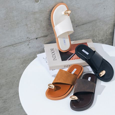 大ヒットしたリングサンダルがブラッシュアップして今年も登場!<br>さらに軽くなり、思わず驚くほどの軽やかな履き心地に進化しました。<br>ぷっくりとした立体的なゴールドパーツを合わせて唯一無二のデザインに仕上げました。オーバー過ぎないすっきりとした底周りで、カジュアルな印象のあるトングデザインでも上品に着用いただけます。トング部分とアッパーが足をしっかりホールドして軽い履き心地なので、長時間のお出かけやリゾートでの着用にもピッタリ◎大人気だった3色に加え、今年は”キャメルスエード”が新登場!どのカラーもシーズンムードを盛り上げてくれること間違いなしのアイテムです。