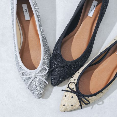 大ヒットしたバレエシューズ春夏の季節感溢れる素材になって登場!シャープなポインテッドトゥで可愛らしくなり過ぎず、足元をすっきり大人っぽく見せてくれます。つま先から踵までもちもちの中敷き入りで、靴の内側にもふわふわ柔らかい素材を使用し、足への負担を軽減して優しい履き心地◎春夏らしいグリッター、控えめで大人可愛いドット、どのカラーもコーディネートにスッと馴染み、ワードローブに1足持っておくとヘビロテ間違いなしのアイテムです!