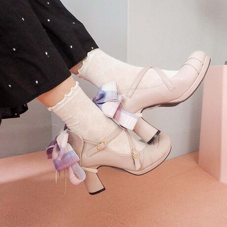 ぽっこり丸みのあるおでこトゥに、大きなリボンを合わせた存在感たっぷりの厚底パンプス。