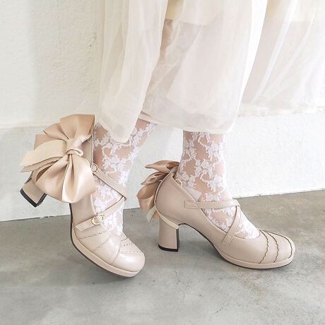 ぽっこり丸みのあるおでこトゥに、大きなリボンを合わせた存在感たっぷりの厚底パンプス。