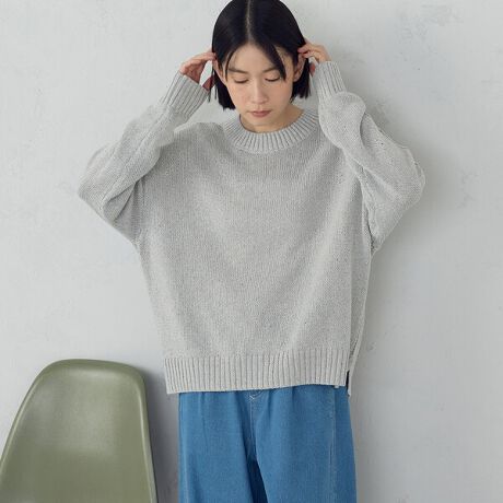 ゆったりしたクルーネックで顔まわりがすっきりと見えます。