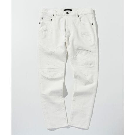 薄く散らしたペイント加工とこだわりのダメージが、やりすぎない大人のこなれ感を演出。