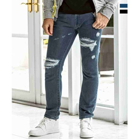 ダメージの中に忍ばせたラインストーンが動く度に輝きラグジュアリーなアクセントに。