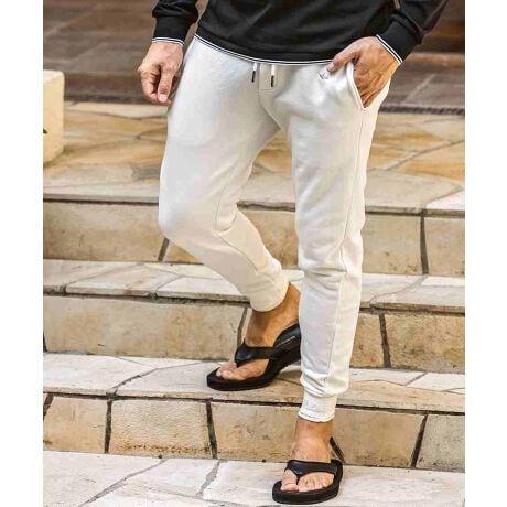 光沢のある糸で刺繍したブランドロゴが上品な艶感を放つスウェットパンツ。