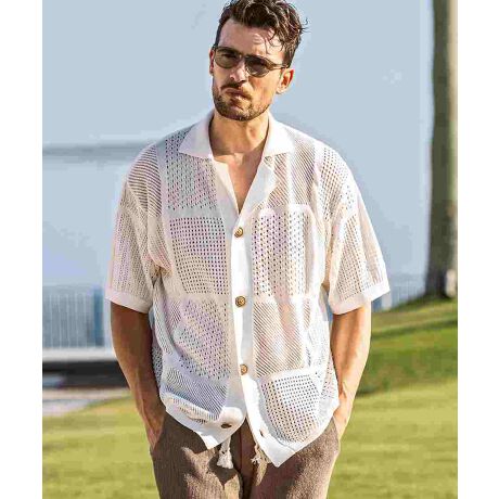 柄違いの透かし編みをブロックに配した開襟シャツ。