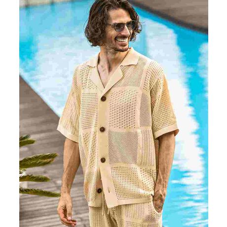 柄違いの透かし編みをブロックに配した開襟シャツ。