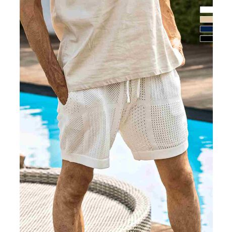 柄違いの透かし編みをブロックに配したハーフパンツ。