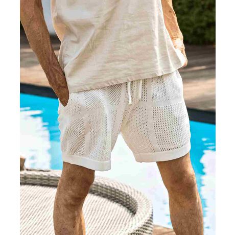 柄違いの透かし編みをブロックに配したハーフパンツ。