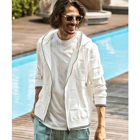 編み込んだような立体的なブロックデザインがクラス感を漂わせる、オリジナルテキスタイルで仕立てたニットパーカー。
