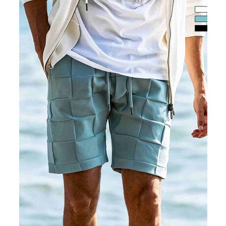 編み込んだような立体的なブロックデザインがクラス感を漂わせる、オリジナルテキスタイルで仕立てたショートパンツ。